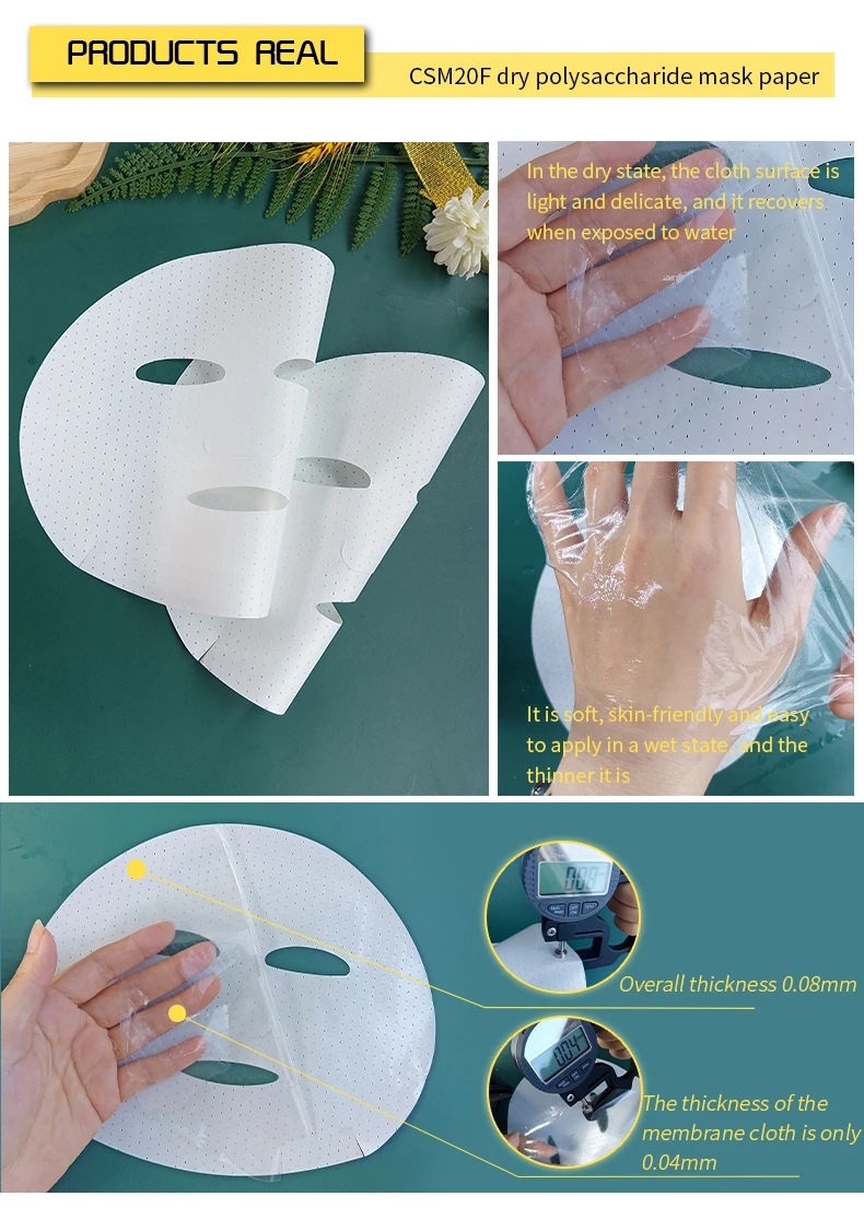 "Dry polysaccharide mask fabric substrate" natural and environmentally friendly ingredients are made from natural marine plants and terrestrial plants, which are environmentally friendly and can be degraded quickly. High water absorption, high lock water, thinner and thinner it can quickly absorb nearly 20 times of its own weight, and there are nearly 10,000 microchannels in each mask to ensure the free penetration of the essence, which can absorb, combine, absorb and store 9-19 times of its own weight.